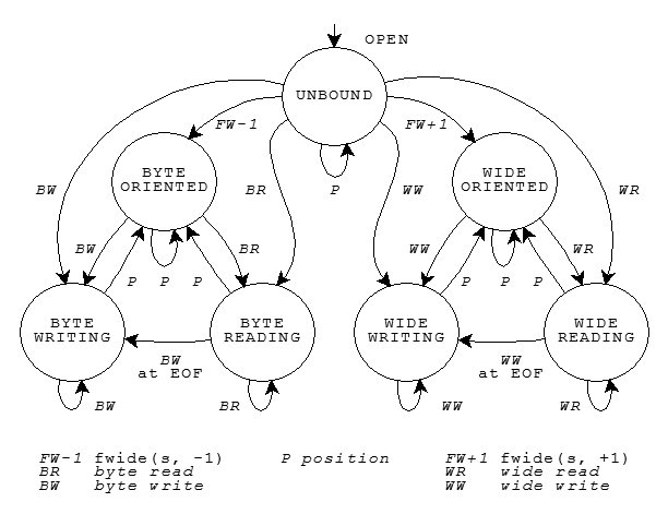 Each of the circles denotes a stable state. Each of the lines denotes a transition that can occur as the result of a function call that operates on the stream. (The ``wide'' states are never entered in the Embedded C++ library.) Three groups of functions can cause state transitions. All are declared in <stdio.h>: